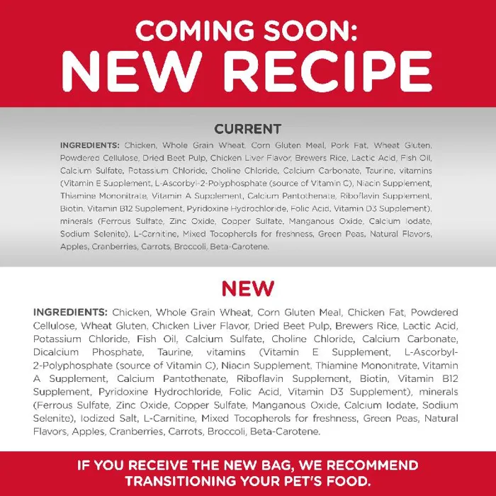 Old Formulation: Chicken, Whole Grain Wheat, Corn Gluten Meal, Brewers Rice, Pork Fat, Egg Product, Dried Beet Pulp, Chicken Liver Flavor, Flaxseed, Wheat Gluten, Lactic Acid, Fish Oil, Calcium Sulfate, Potassium Chloride, Soybean Oil, Choline Chloride, Calcium Carbonate, Taurine, vitamins (Vitamin E Supplement, L-Ascorbyl-2-Polyphosphate (source of Vitamin C), Niacin Supplement, Thiamine Mononitrate, Vitamin A Supplement, Calcium Pantothenate, Riboflavin Supplement, Biotin, Vitamin B12 Supplement, Pyridoxine Hydrochloride, Folic Acid, Vitamin D3 Supplement), minerals (Ferrous Sulfate, Zinc Oxide, Copper Sulfate, Manganous Oxide, Calcium Iodate, Sodium Selenite), L-Carnitine, Iodized Salt, Oat Fiber, Mixed Tocopherols for freshness, Natural Flavors, Beta-Carotene, Apples, Broccoli, Carrots, Cranberries, Green Peas