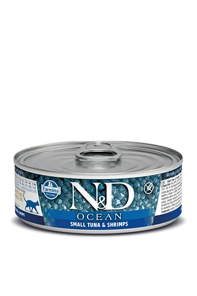 WHOLESOME HYDRATION. N&D rawcanâ„¢ Ocean Tuna & Shrimp Feline is an all-natural complete wet food formulated to meet the nutritional levels for maintenance. Our rawcanâ„¢ technology is a proprietary 1-step gentle steam cooking process to ensure the bioavailability of the nutrients of each ingredient in every diet. Made with GMO-Free and human-grade fresh (never frozen) ingredients like sustainablly sourced wild-caught tuna, cod, herring and shrimp, plus sweet potatoes. Low glycemic index, grain-free and gluten-free recipe with no legumes, soy, by-products, hormones, antibiotics, or artificial preservatives. Made with natural antioxidants, prebiotics and integrated additional taurine. No Guar, Xanthan, Cassia, Industrial Gums, Carrageenan, or Emulsifiers used. No water or broth added for processing. All formulations are scientifically-proven and clinically-tested thru certified cruelty-free research. Fully recyclable BPA-Free cans with FSC paper labels.