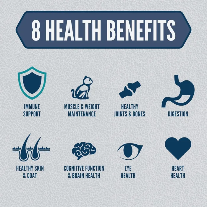 - Helps support 8 key health benefits including Immune Support, Digestion, Healthy Skin & Coat, Heart Health, Eye Health, Muscle & Weight Maintenance, Healthy Joints & Bones and Cognitive Function & Brain Health.
