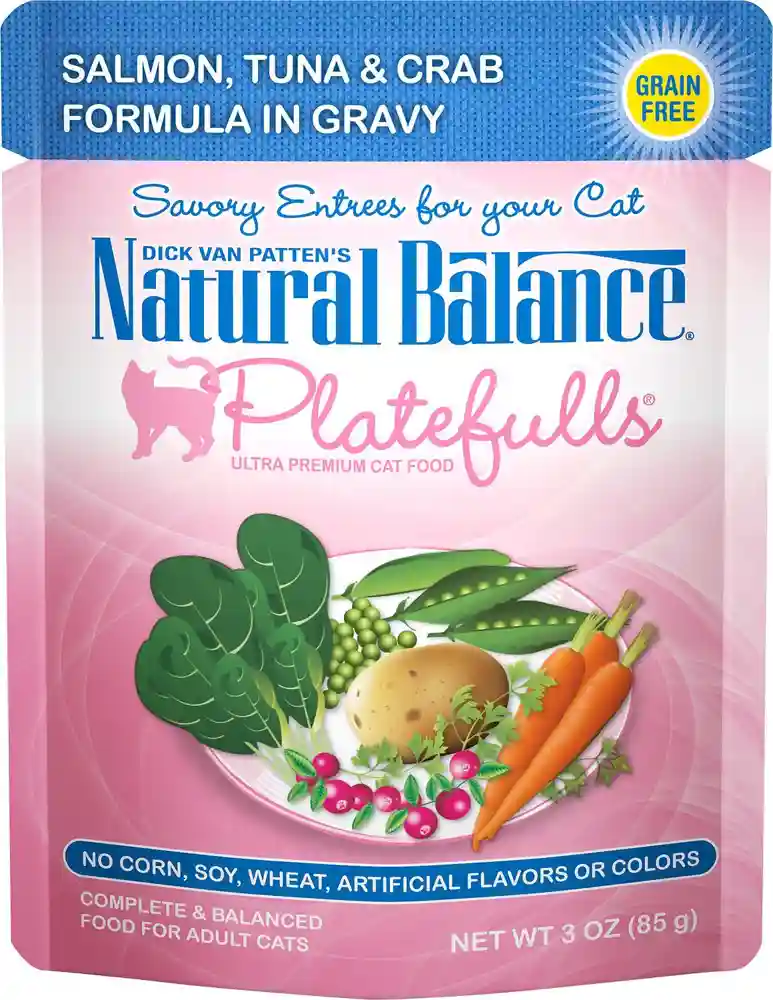 Treat your kitty to a plateful of goodness in every bowl with the Natural Balance Platefulls Salmon, Tuna & Crab Formula in Gravy Grain-Free Cat Food Pouches. Made especially for kitties with gourmet tastes, it features salmon, tuna, and crab as the top ingredients for all the protein your pal needs to thrive - not to mention the irresistible flavor that'll have him running to his bowl every time. It's made with wholesome veggies for a boost of antioxidants in every juicy bite, and real broth so it supports urinary health and keeps your kitty hydrated. Since it's fortified with vitamins, minerals and essential taurine, it makes a complete and balanced diet for adult cats. Plus, it has zero grains or anything artificial. Because foodie or not, he's a carnivore at heart.