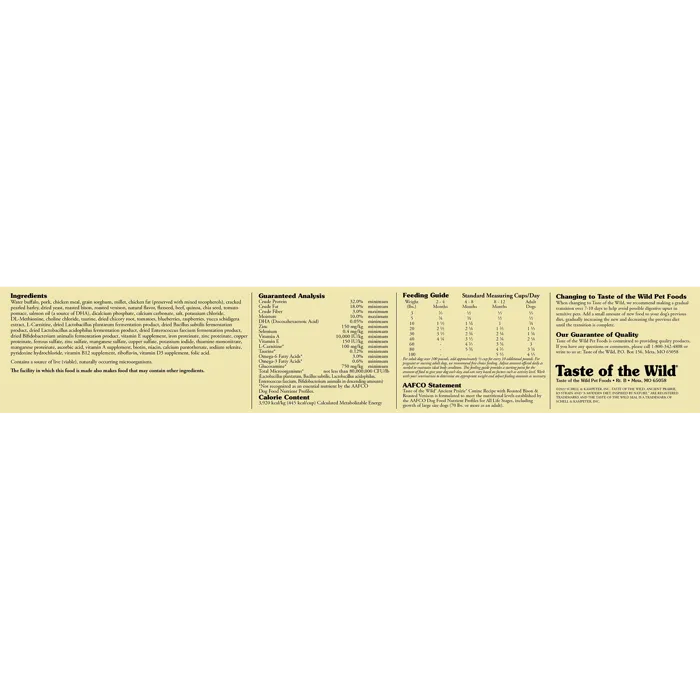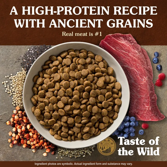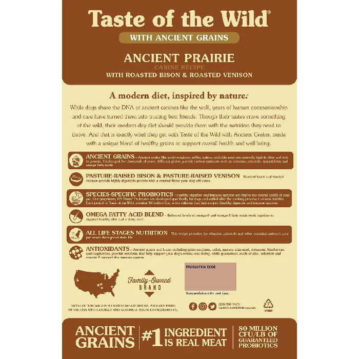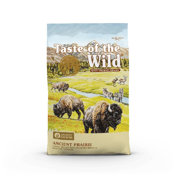 Feed your canine companion a balanced diet with ingredients straight from nature with Taste of the Wild Ancient Prairie Roasted Bison, Roasted Venison & Grain Recipe Dry Dog Food! It features a tasty duo of pasture-raised, roasted bison and venison, which not only offers your pup a source of highly digestible protein, but also the wag-worthy flavor he loves. This recipe is crafted with a combination of whole grains like millet, quinoa, chia seed and sorghum to support your sidekick’s overall health and is completely free of corn, wheat, filler and artificial flavors, colors and preservatives!